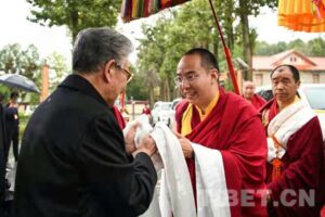 Phagpalha Geleg Namgyal, vice chairman of the National Committee of CPPCC, honorary chairman of the Buddhist Association of China, and chairman of the CPPCC Tibet Autonomous Regional Committee, exchanges greetings and Khada with the 11th Panchen Lama.
