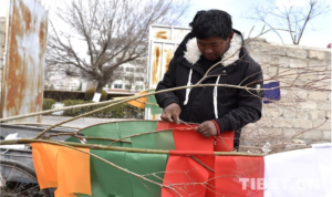 This year, the Tibetan New Year coincides with the Spring Festival. As the New Year gets closer and closer, many farmers and herdsmen are sewing multicolored prayer flags for sale in the Lhalu Community in Chengguan Garden, Chengguan District, Lhasa, forming a “temporary market”. The streets are filling with the strong flavor of the New Year.