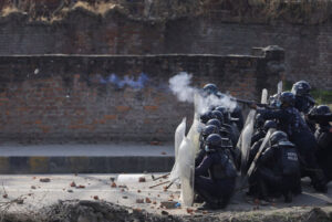 Police fires tear gas towards the demonstrators during a protest against the $500 million US infrastructure grant under the Millennium Challenge Corporation (MCC) near the parliament in Kathmandu, Nepal on Feb 27, 2022. [Photo/Agencies]