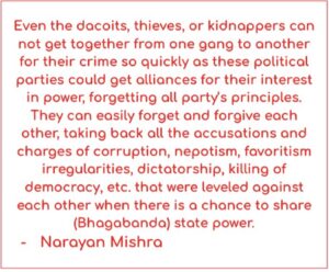 Because of this, we have been experiencing the country’s self-centered, unprincipled, unstable, and anti-multiparty system government for the last couple of years. They unite when they see a chance to share power and positions. Immediately, they fight when they find some loss and gain in power-sharing and many other unseen benefits. We do not see any party principles in their uniting and separating. This has been going on in the country. They never get together for the cause of the people’s suffering and the country’s development. To depict this disturbing political situation, once I wrote the following sentences in my article “Electorial Alliance A Betrayal for Voters, Democracy,” published in People’s Review on April 26, 2022.